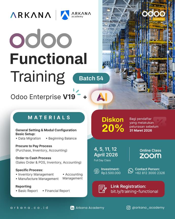 Training Functional bertujuan agar para peserta dapat memahami fungsionalitas modul Odoo ERP yang luas. Mengikuti training functional akan membantu Anda dalam pekerjaan sehari-hari dengan Odoo ERP, serta memahami konfigurasi modul.