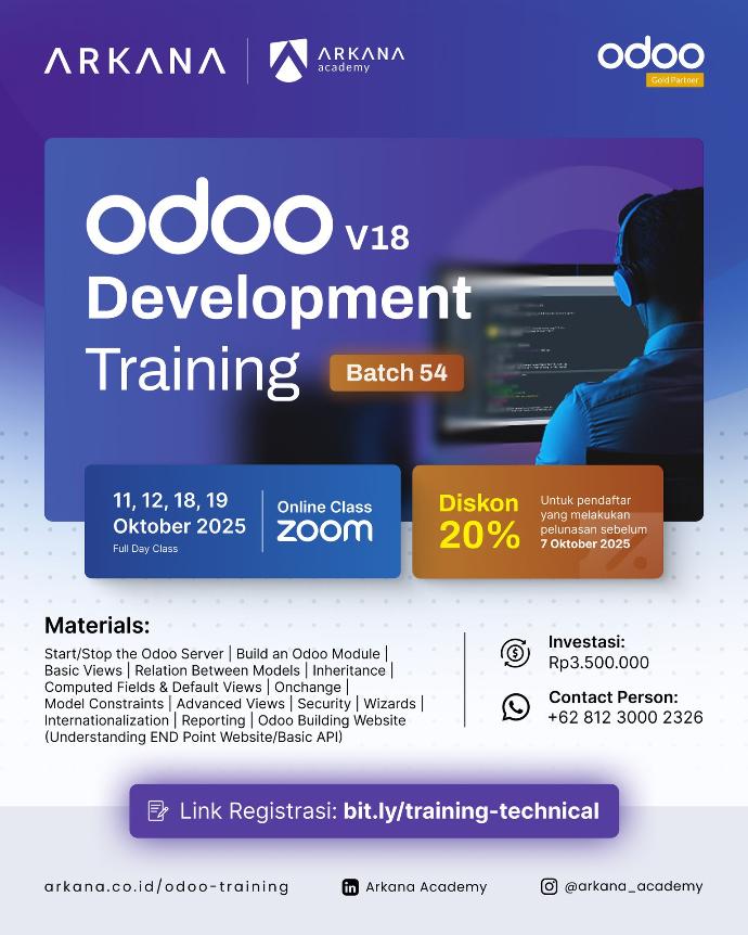 Training development ini diperuntukkan bagi semua kalangan, baik itu mahasiswa, karyawan ataupun bisnis owner yang ingin mempelajari lebih dalam tentang cara custom fitur pada Odoo.